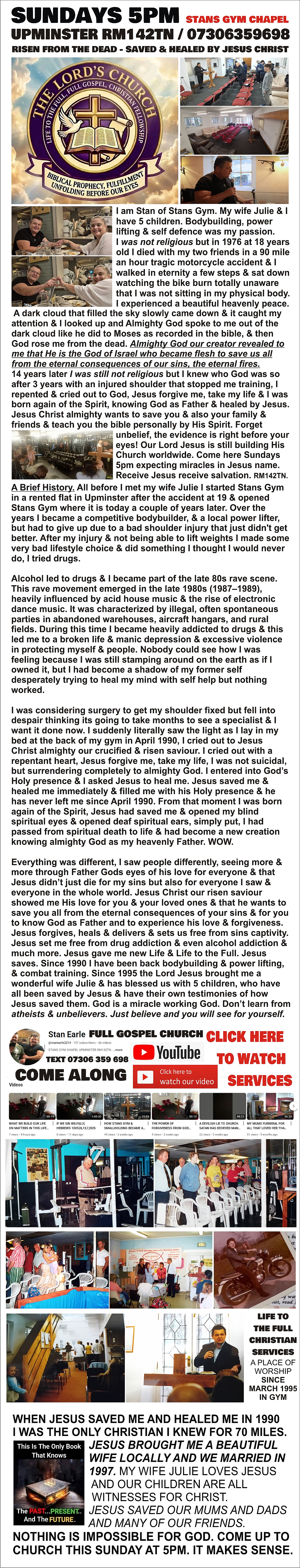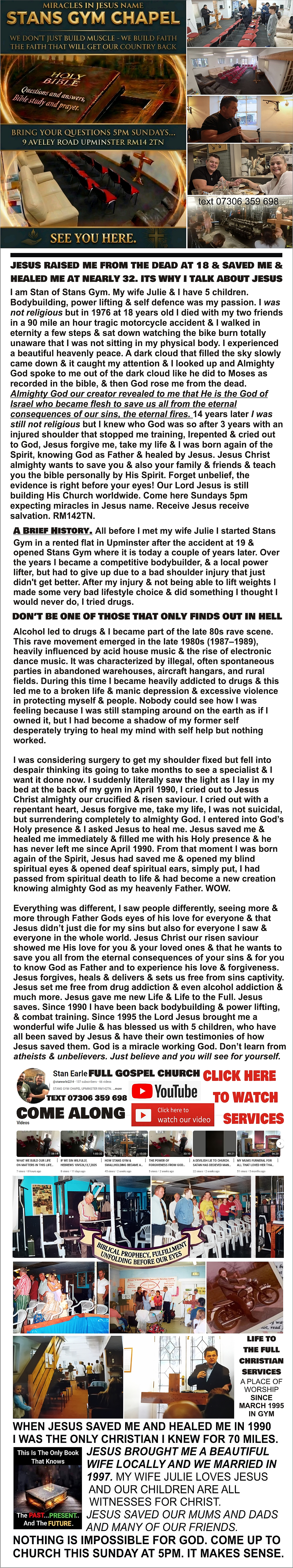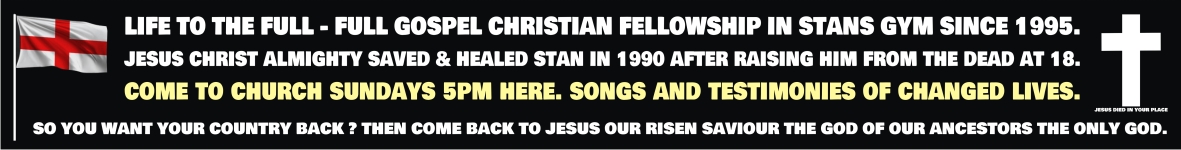 See you soon. Come training. Stans Gym is a special place not because of me, but because of Jesus who is the Lord of it. It's why satan tries to keep people away from it. Satan wants you to think. I don't want anything to do with religion. Well the truth is. Jesus is not a religion he is almighty God. Over the years loads of people have been healed, saved and helped by God here at Stans Gym.
